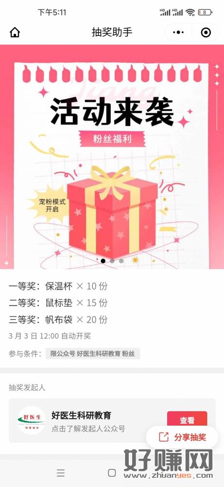 关注微信公众号【好医生科研教育】回复“3月活动” 参与抽奖 奖品:保温杯 鼠标垫 开奖时间:3月3日