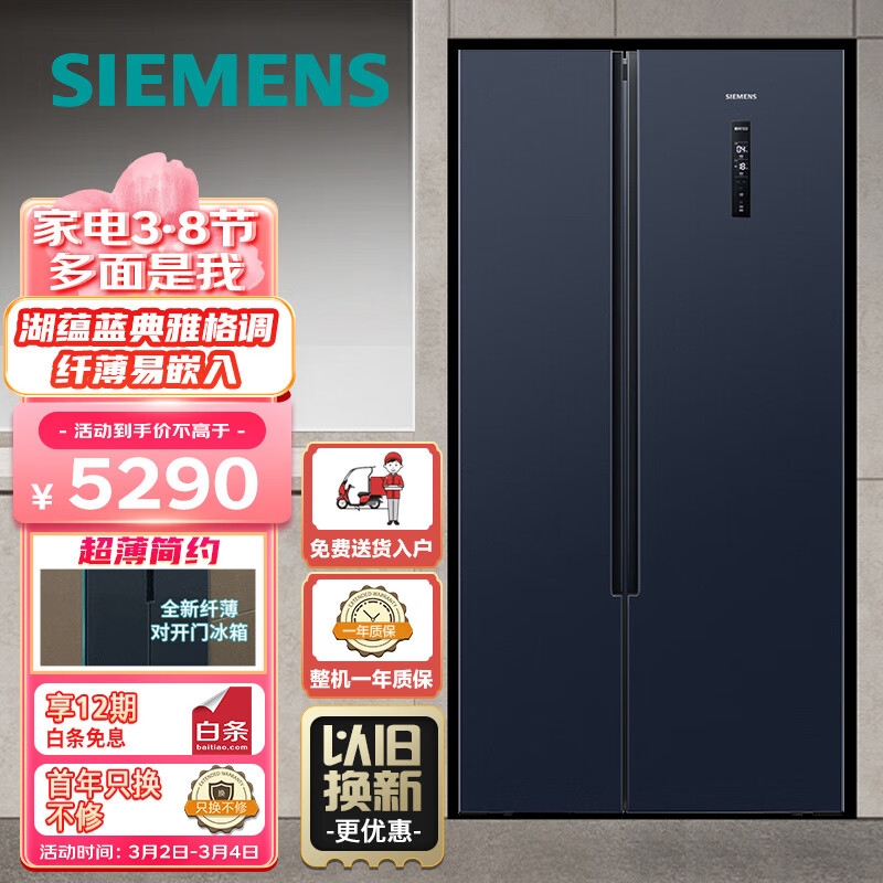 西门子(SIEMENS) 502升变频冷藏双开门超薄嵌入式冰箱 湖蕴蓝