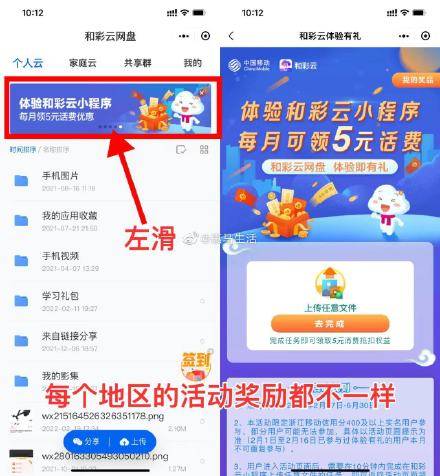 【全国移动和彩云领2~10元话费】微信搜索小程序“和彩云网盘”->首页轮播图左划->每个地区的活动都不一样->根据提示完成任务领话费!