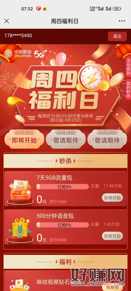 四川移动用户10点领7天5GB包或者500语音