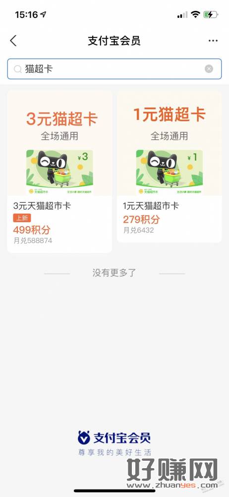2,支付宝-我的-支付宝会员-特色栏-可用499积分兑换3元天猫超市卡,有效期15天