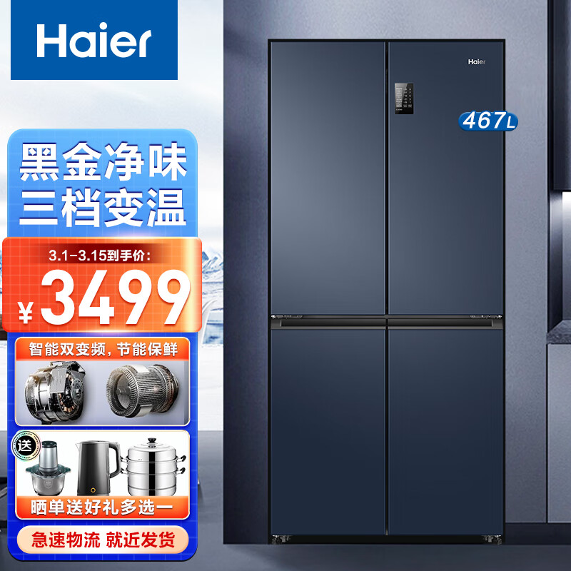 Plus9.9开家居卡领499-40,海尔(Haier)一级能效风冷无霜超薄净味三档变温电冰箱 4开门467升