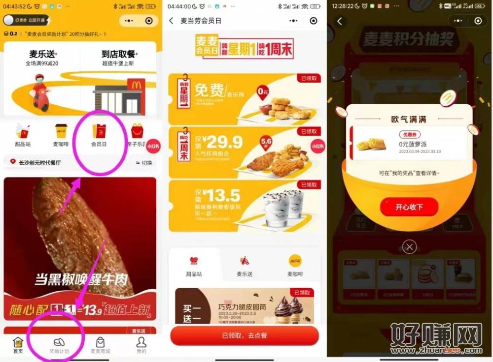 麦当劳到店免费吃鸡块+菠萝派。 微信小程序搜索“麦当劳”->进入图片标记的两个入口即可->