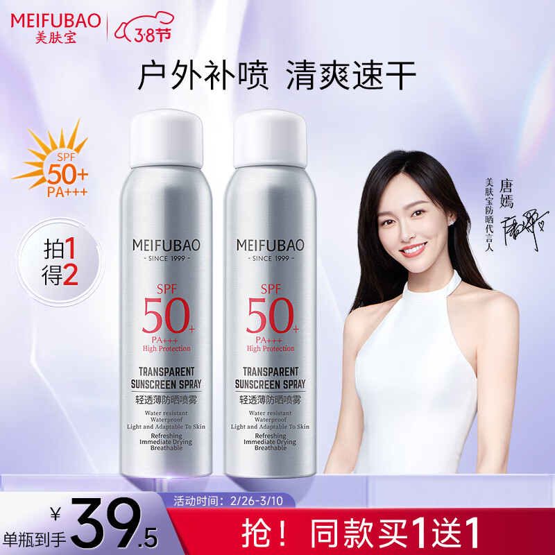 美肤宝 轻透薄防晒喷雾SPF50+PA+++150ml,拍1赠1,到手69亓自营免u