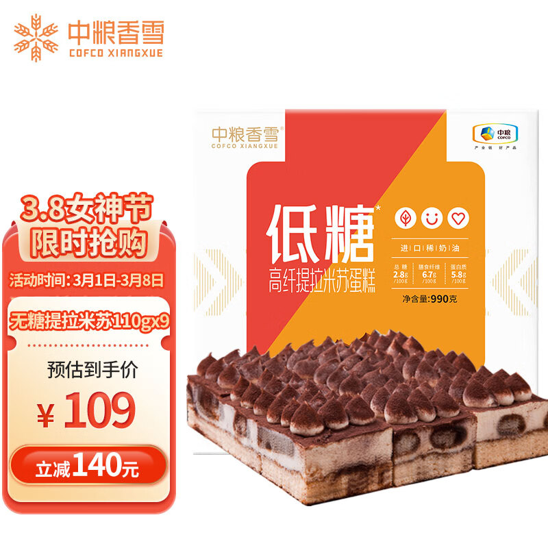 中粮香雪 低糖高纤提拉米苏蛋糕 990g,拍下付109亓