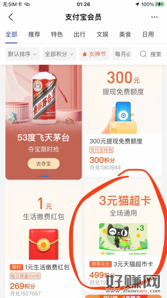 支付宝会员积分下拉换天猫卡,我积分差几十不够