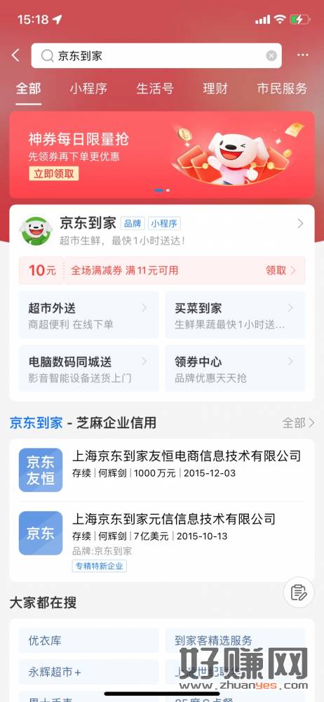 支付宝app搜[ 京东到家 ]反馈有机会领到11-10的券