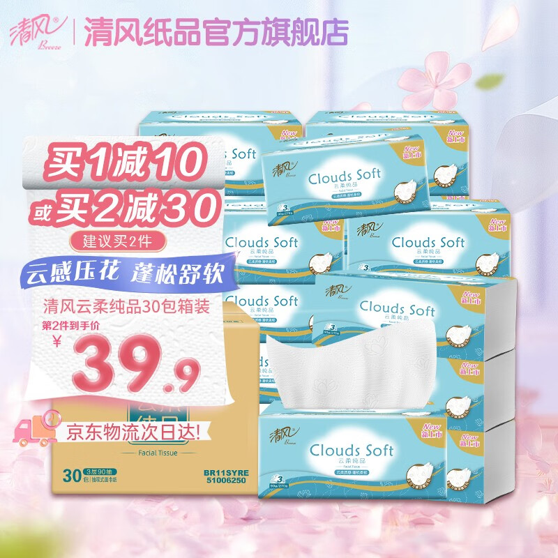 清风 云感浮雕压花柔韧亲肤抽纸 整箱30包