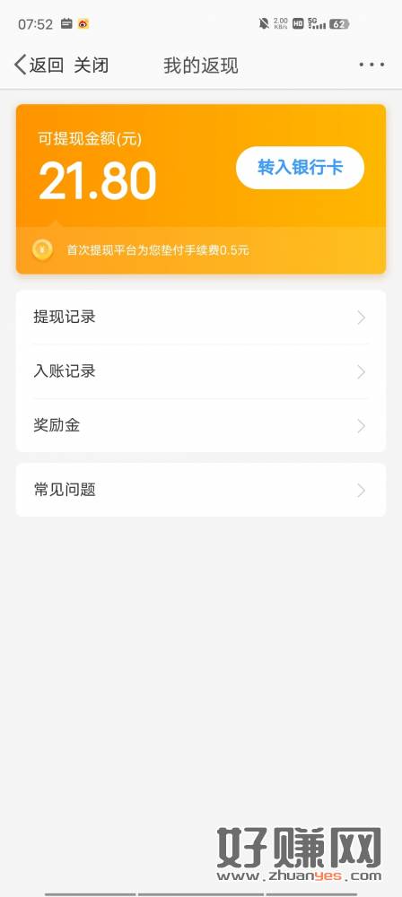 最后到借钱,我的返现,奖励金里去绑卡提21.8