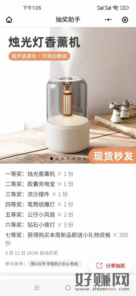 关注微信公众号【学姐的少女心】回复“抽奖” 参与抽奖 奖品:香薰机 充电宝 开奖时间:3月11日
