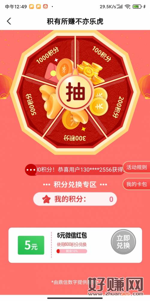 收到短信,我没飞。第一时间去的。搞了4个5元。奖品还有百分之9。