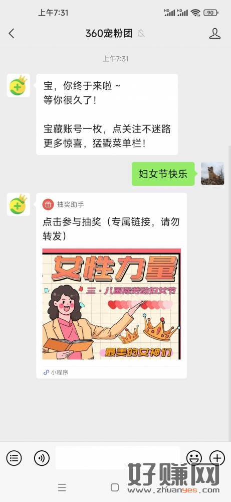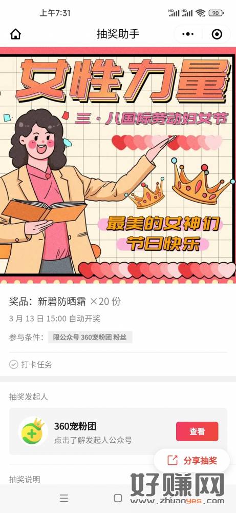 关注微信公众号[ 360宠粉团 ]回复“妇女节快乐” 参与抽奖