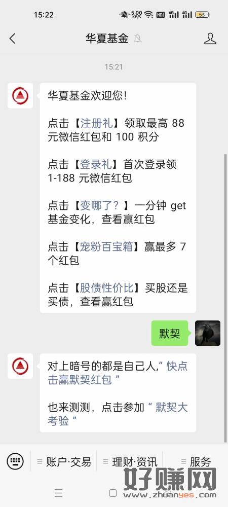 关注 华夏基金,gzh,回复,默契,直接领取0.3元,简单粗暴,俺已经领取1.5元了,啥也别说了,冲废它
