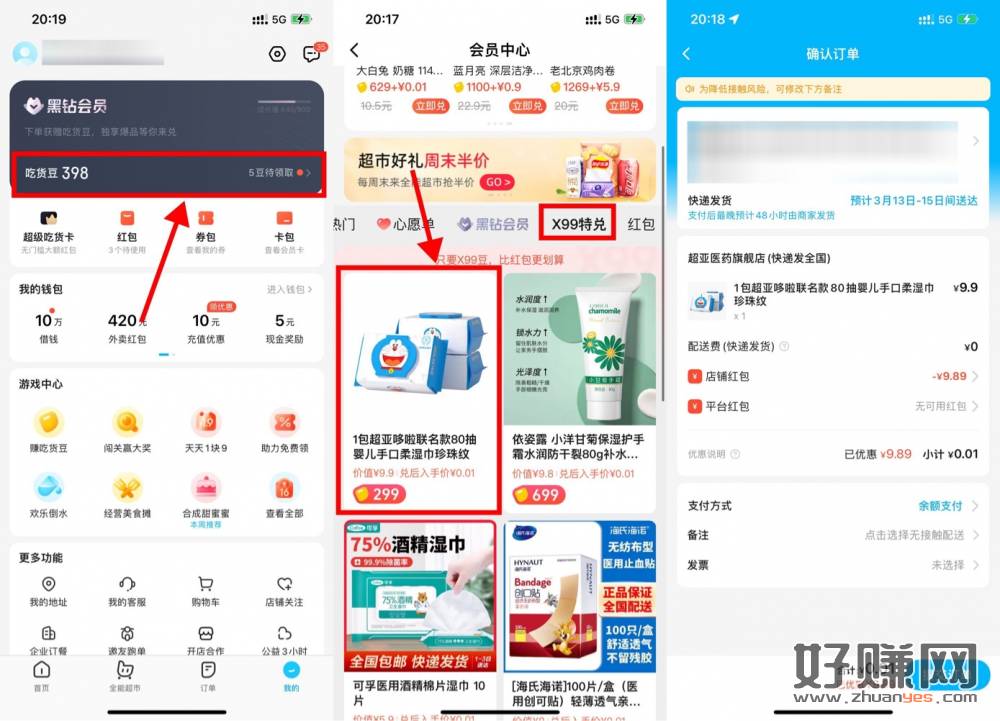 【饿了么299吃货豆兑换联名湿巾】饿了么APP->我的->吃货豆->X99特兑->299吃货豆兑换联名款湿巾包邮,可多次兑换!