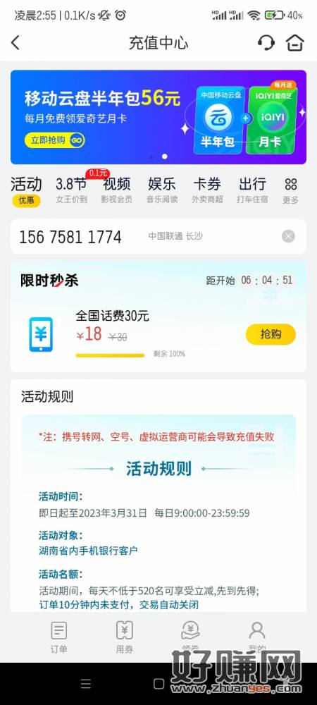 湖南邮政充话费18充30有需要的去,每天九点开抢,还有六个小时,赶紧睡觉早点起来抢