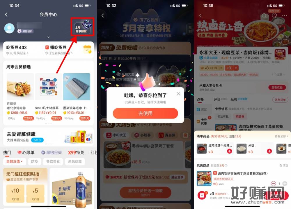 【饿了么会员免费领永和大王t 餐】限饿了么钻石和黑钻会员参与!饿了么APP->我的->会员中心->3月专享特权->10点30分免费领取价值50元的永和大王宫保鸡丁蒸蛋饭t 餐,直接免费吃