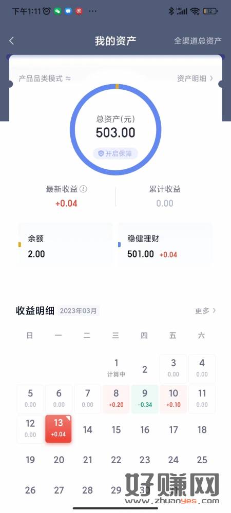 app进去首页,图1所示,进去开二类,买理财,500,这个理财会冻结6个月。我问过身边玩基金的朋友,这个基金到期后,浮动非常小,盈亏大概在1-3个点左右,所以很安全,不存在反撸。