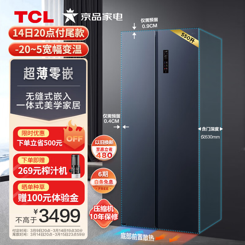 P家居特权卡领499-40京贴券,TCL 550L双开对开门冰箱 超薄嵌入式 R550T9-SQ