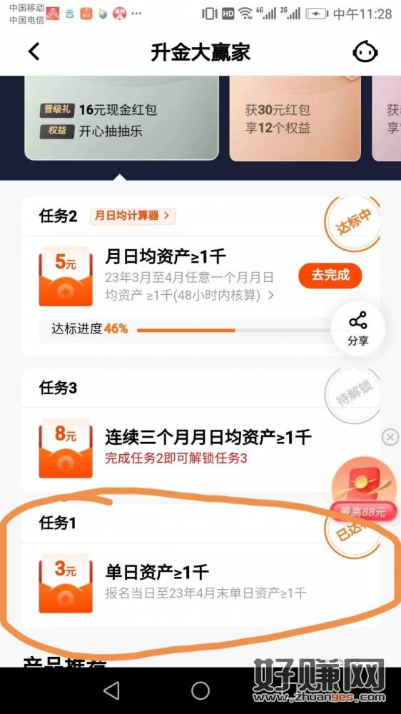 搜 升金大赢家,报名,单日资产达1千即可领取3元现金,也有其他任务。