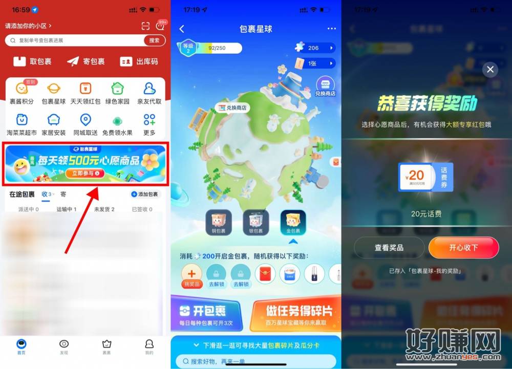 【菜鸟包裹星球每天抽话费或实物】每天去玩别忘了!菜鸟APP首页横幅进入->简单任务得碎片,全部做完有200左右->选择金包裹打开,抽话费满减券或实物包邮