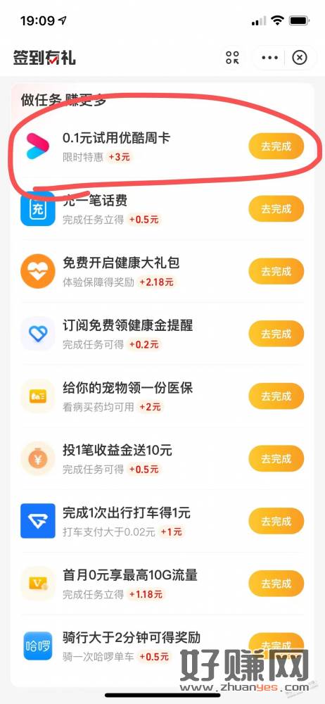 消费券页面-点击上方立即签到-做任务赚更多栏-找到0.1元使用优酷周卡