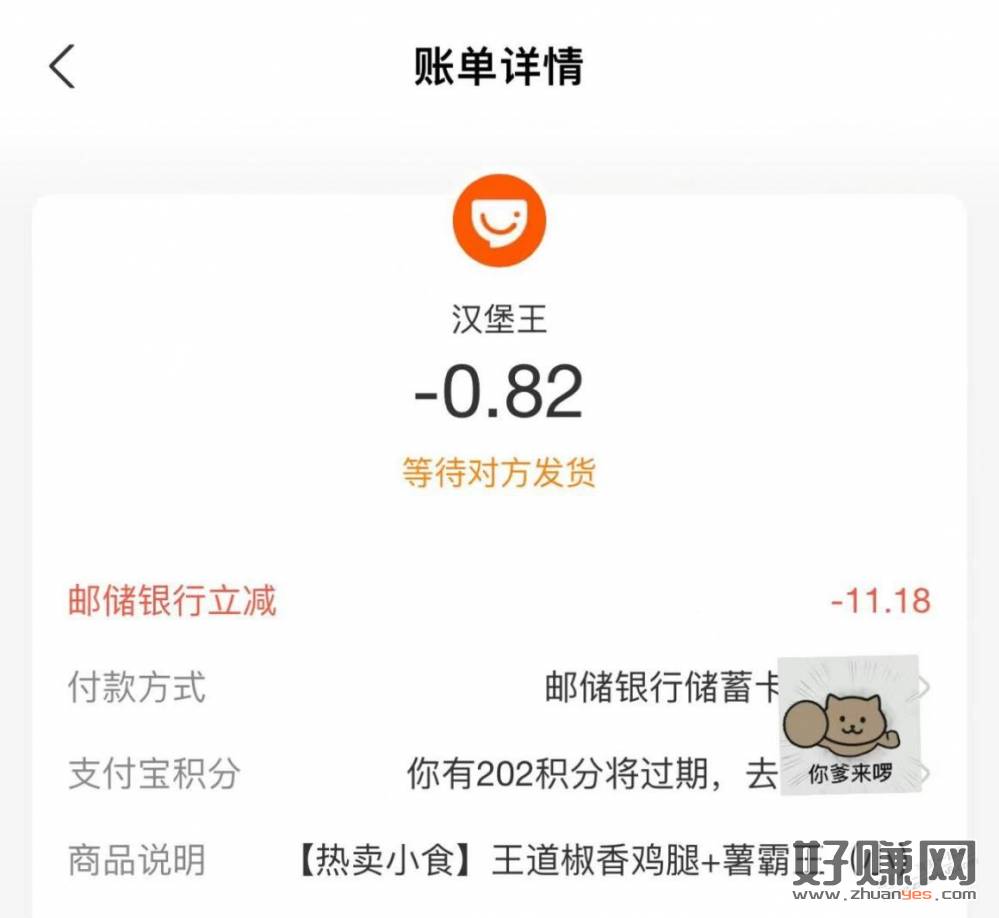 高德搜索汉堡王12块钱鸡腿加薯条套餐 支付宝付款邮储储蓄卡出来减11块多 实付8毛左右