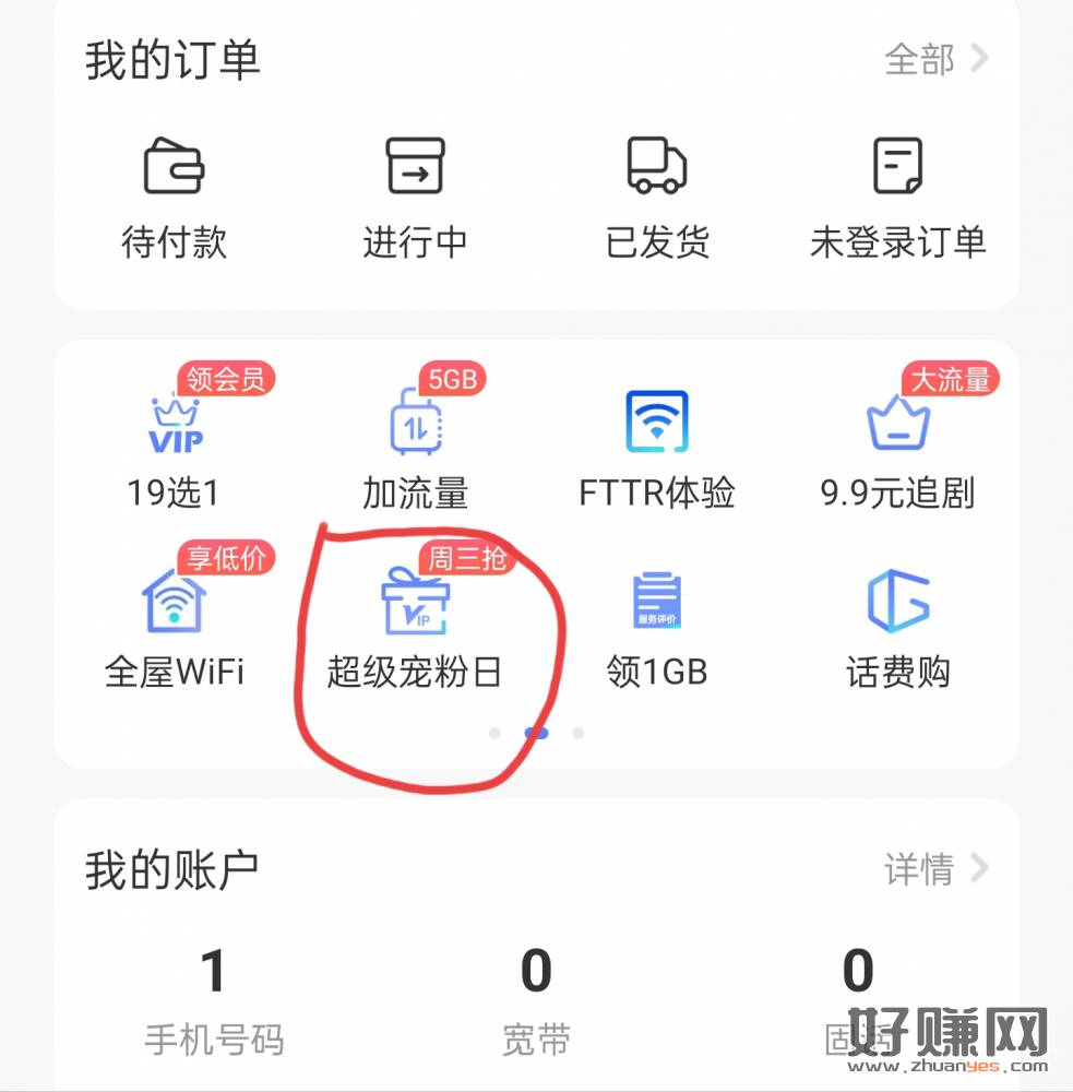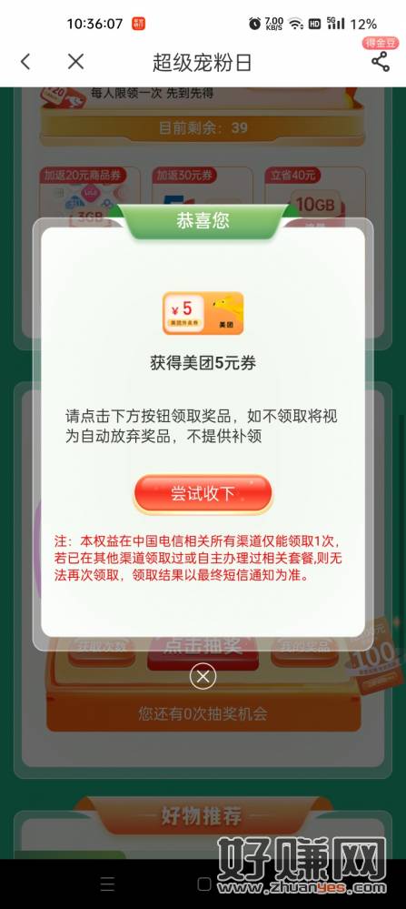 电信APP,我的,超级宠粉日,认卡券,话费是专用的,没用。