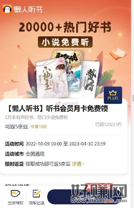 京东plus免费领懒人听书会员月卡 还送5京豆
