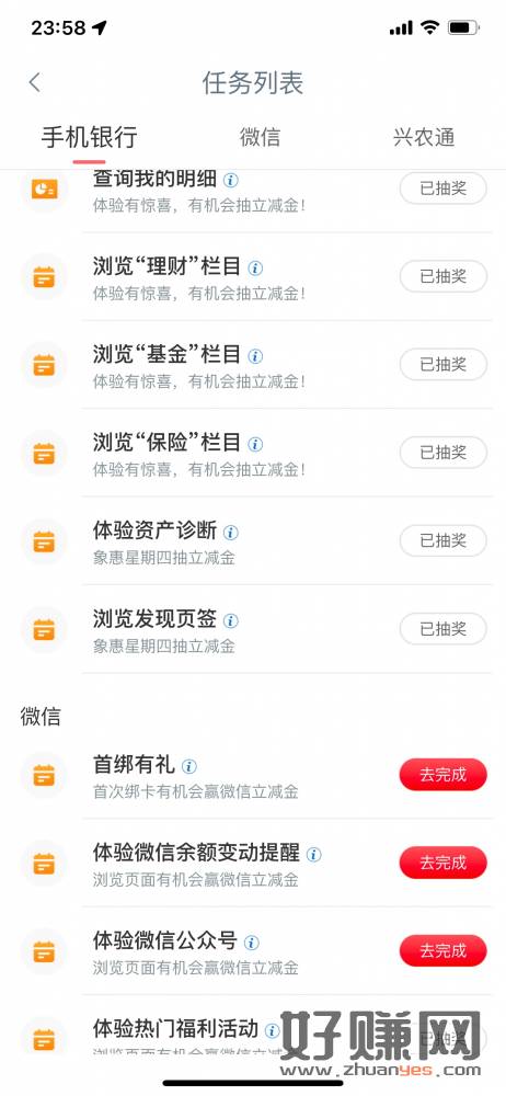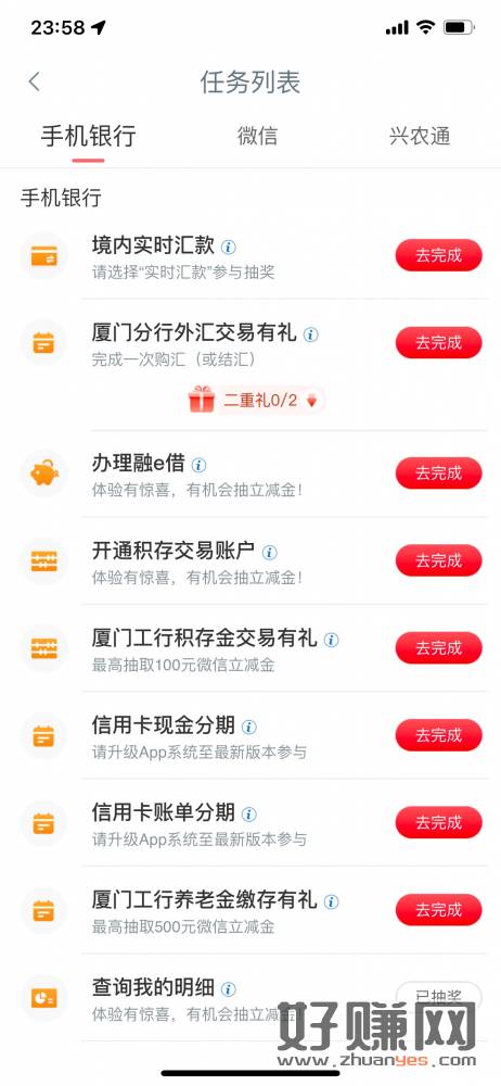 工商银行现在好多任务。我的是厦门工商的。试一试,抽立减