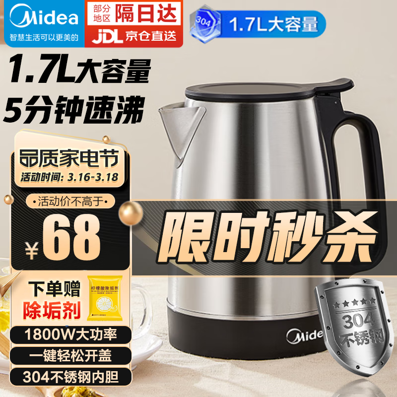 PLUS先领105-5全品,美的(Midea)304不锈钢热水壶1.7L
