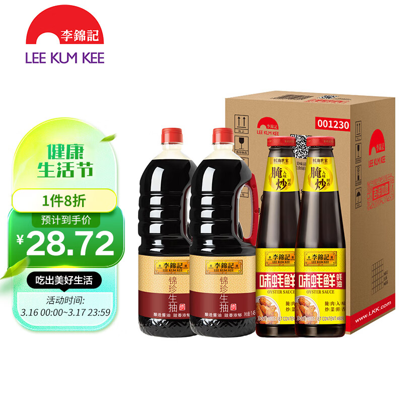 李锦记 家庭常用调料组合装,锦珍生抽1.45kg*2+味蚝鲜480g*2
