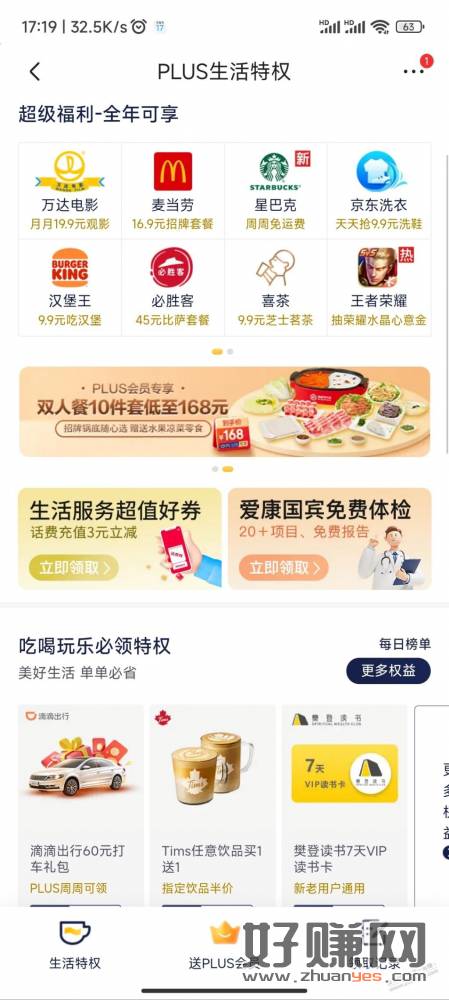 京东plus生活特权,中间位置,还有一个爱康国宾体检套餐,不过体检的城市太少了