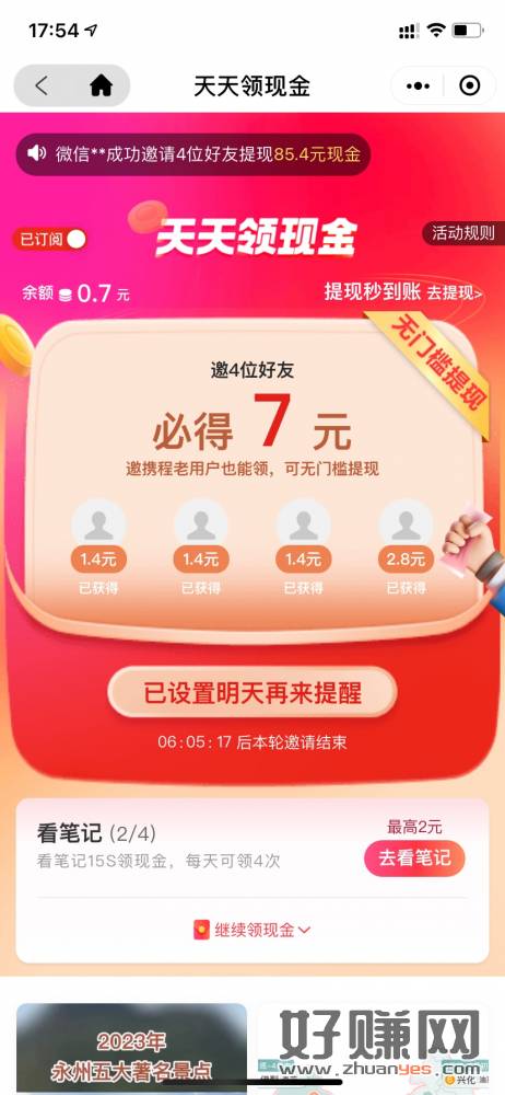 战国老毛 携程小程序拉四人助力无门槛提现秒到