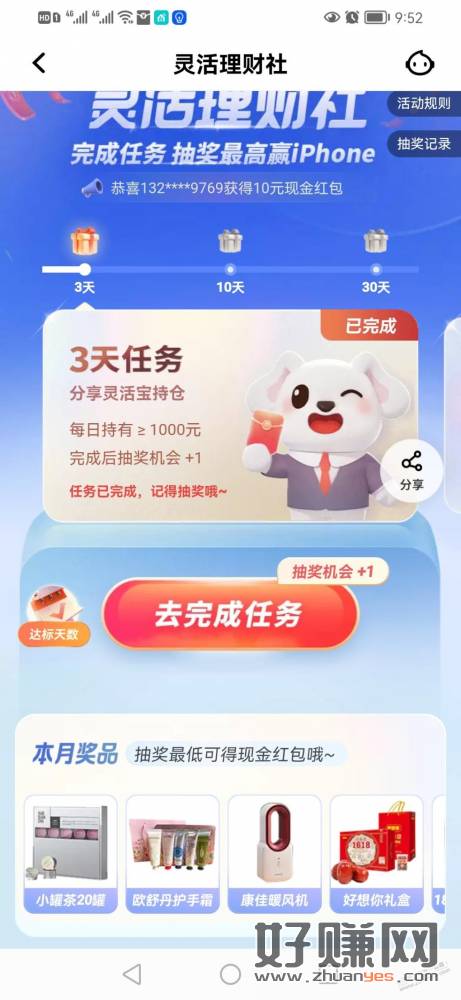 受邀的搜灵活理财社进去报名,投1千,每第3天/10天/30天总可获得3次抽奖机会,除了可抽中现金外,也有可能中实物。