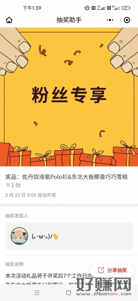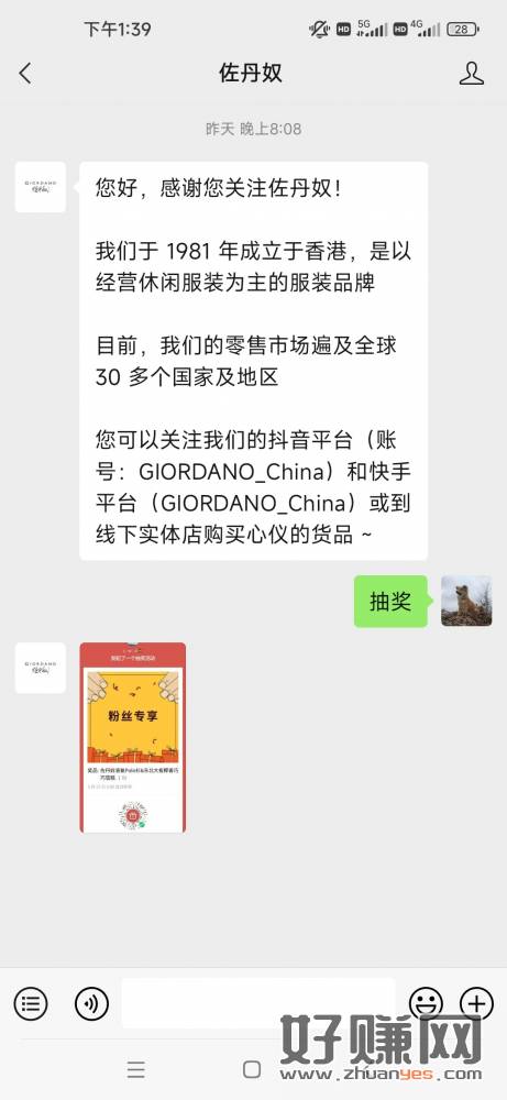 关注微信公众号【佐丹奴】回复“抽奖” 参与抽奖 奖品:衣服 雪糕 开奖时间:3月23日
