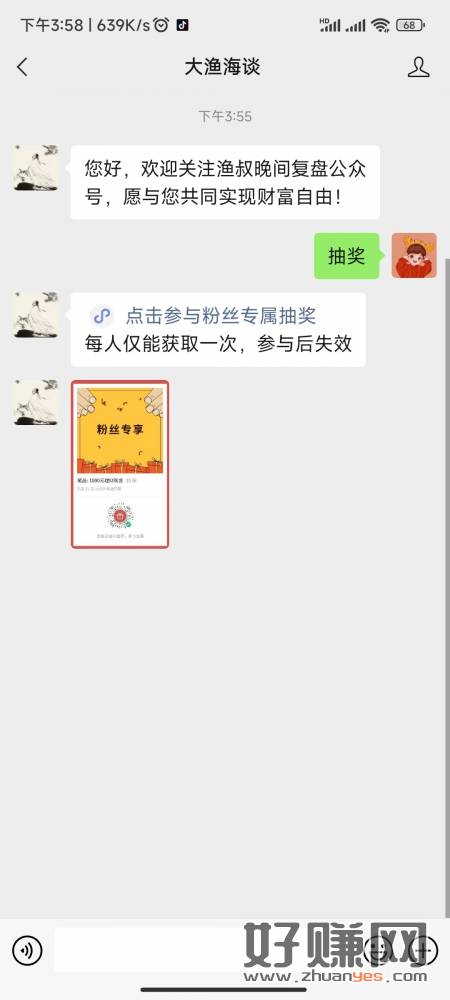 关注微信公众号[ 大渔海谈 ]回复“抽奖” 参与抽奖 奖品:1