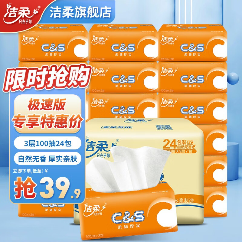 洁柔 阳光橙无香软抽纸3层100抽24包/箱