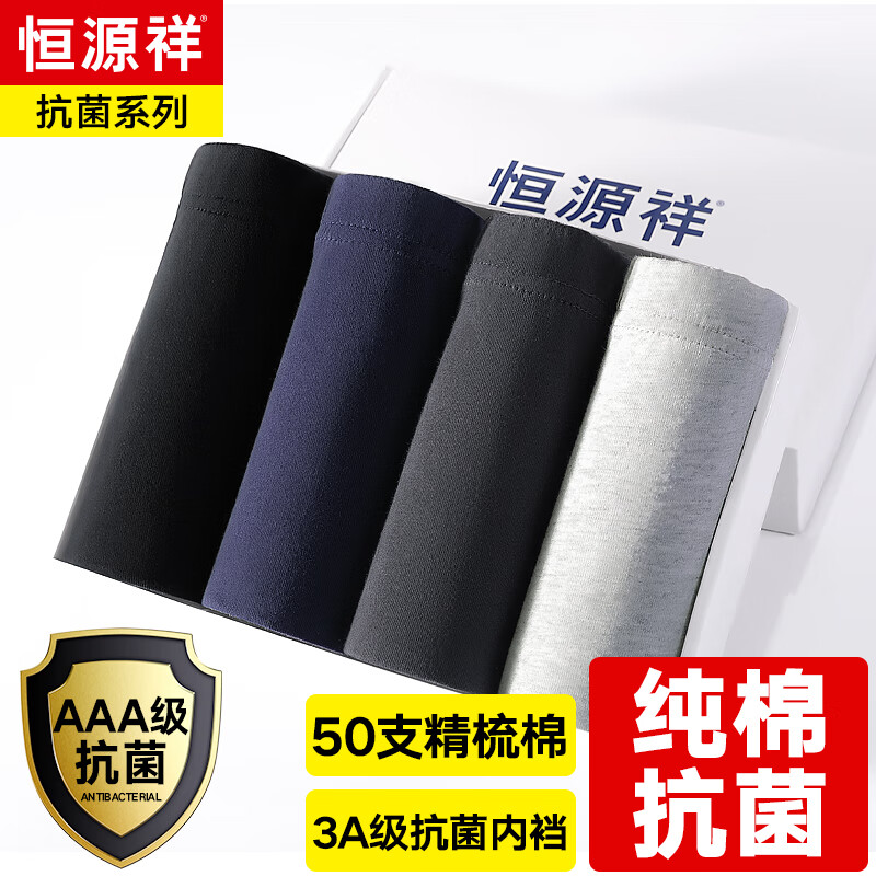 恒源祥 男士纯棉抗菌平角内裤,4条礼盒装(抗菌裆部)