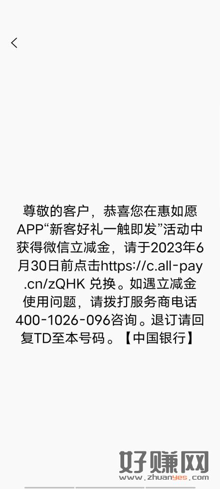 兑换。如遇立减金使用问题,请拨打服务商电话400-1026-096咨询。退订请回复TD至本号码。【中国银行】