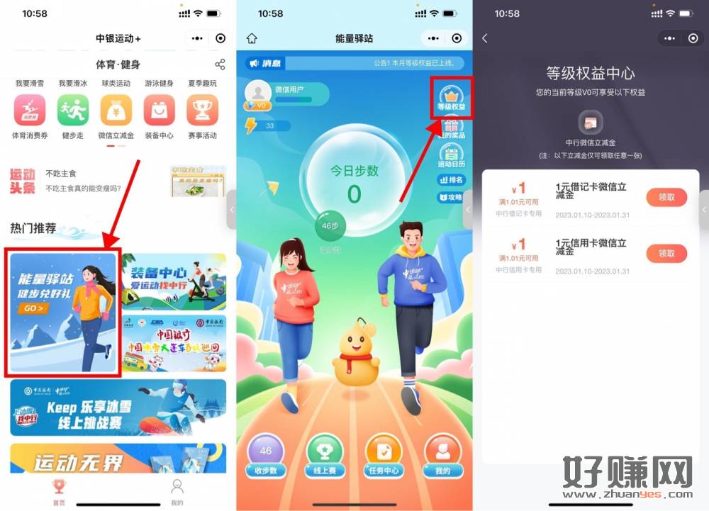【中行直接领取1元微信立减金】这个月没领过的上!微信进入小程序“中银运动+”->能量驿站健步兑好礼->右上角“等级权益”->直接领取1元微信立减金!