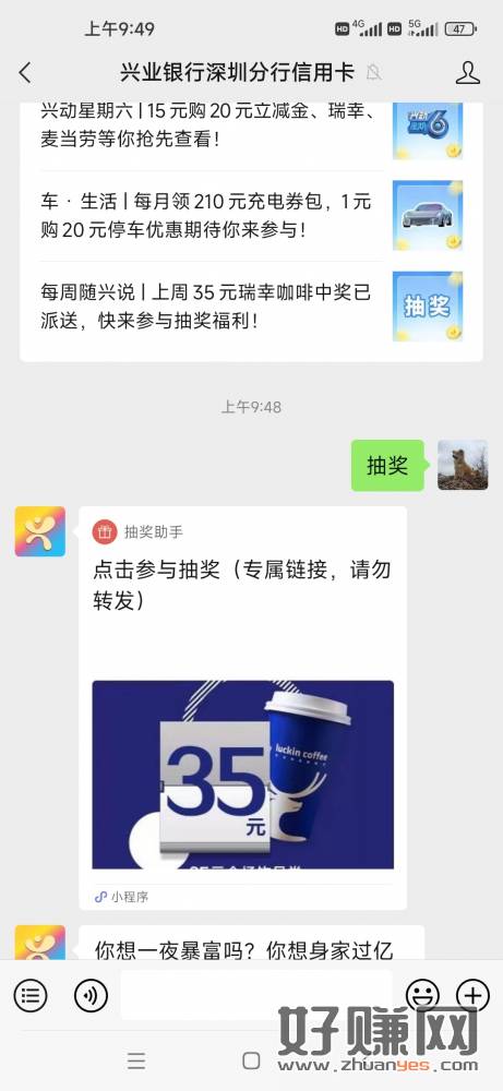 关注微信公众号【兴业银行深圳分行信用卡】回复“抽奖” 参与抽奖 奖品:瑞幸咖啡券 开奖时间:3月24日