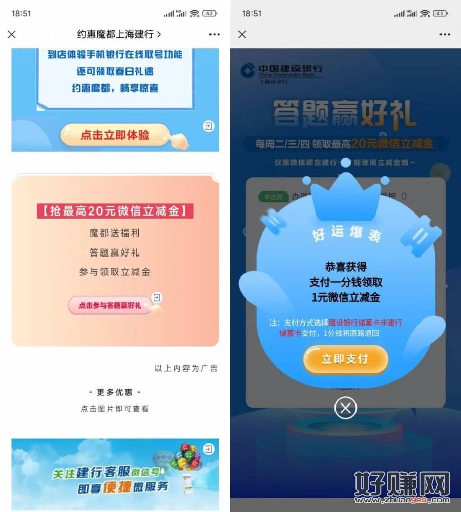 储蓄卡xing/用卡都可撸,每周三元,全国通用。“约惠魔都上海建行”微信公众号发送“答题”点自动回复的文章拉到文末“点击参与答题赢好礼”答题页面下方都有给答案,答完三题抽奖,放量时必中1元,每周二三四都可撸,每天放量时间不确定,没有群通知的话,只能看运气。