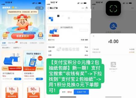 【支付宝积分0元撸2包抽纸包邮】新一期!支付宝搜索“收钱有奖”->下拉找到“支付宝2包抽纸”->用1积分兑换0元下单即可!