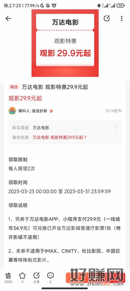 什么值得买APP搜索万达第一个领29.9观影一号俩码,保存好券码,可以自用,也可以出