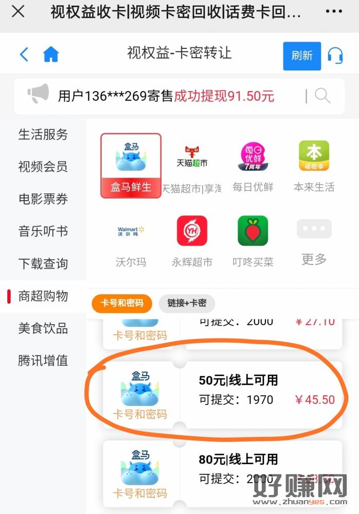 农行湖南长沙卡 盒马app 首页搜礼品卡 买50礼品卡 减10 每天早上8点刷新; 带卡密 复制卡密到别的地方,就有账号和卡密! 视权益可卖利润6