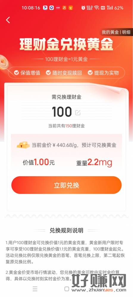 京东金融400积分换100理财金(1元),积分做做任务简单拿。兑换之后搜索理财金,换黄金,黄金秒卖出。要有京东金融积存金账户才能兑换黄金