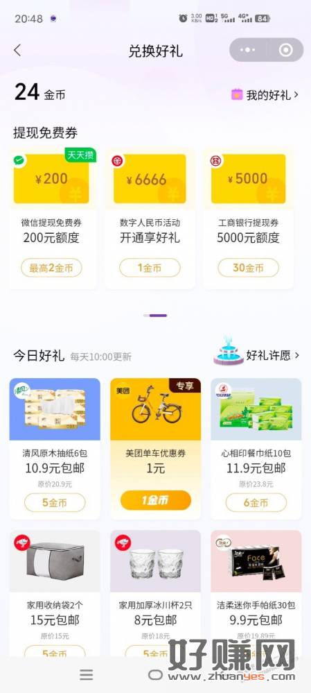微信支付有好礼30金币兑换5000工行免费提现券,第一排第四个。