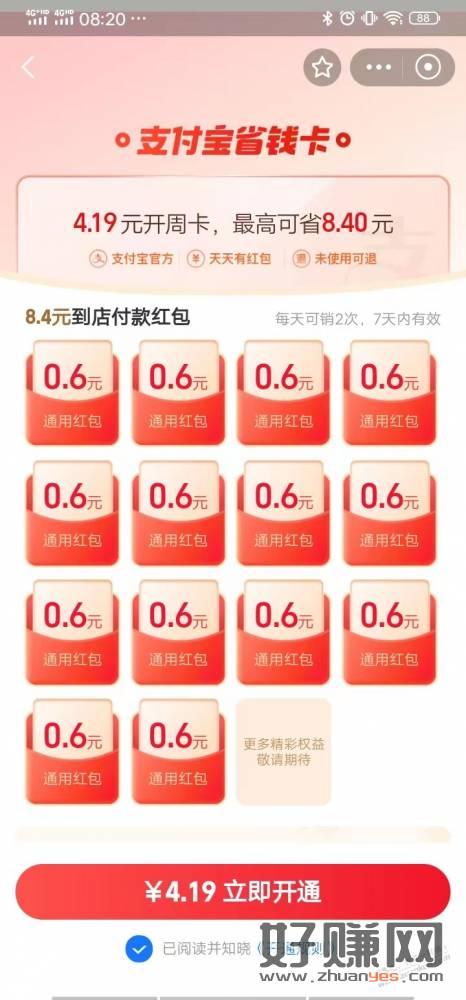 也有的支付宝4.19元购买,0.6元十四张,限每天使用两张