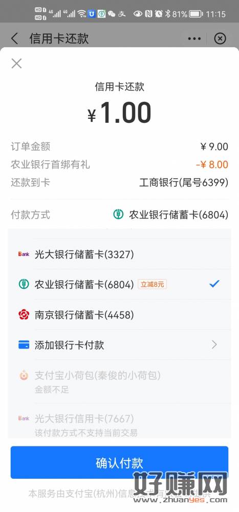 开一张哈尔滨的农行三类卡,绑定支付宝得8元,还信用卡无损t