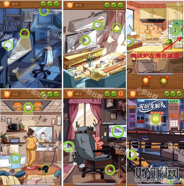这是答案:点 台灯 风扇 电脑 电视的老人 吊灯 挂机的空调 冰箱门儿 洗碗池 微波炉 地上吹风机 流出来的浴池水 流水的浴池头 天花板的灯 明亮的窗户口 黄色的车和 尾气 汽车的前部头的地方 电脑屏 床头的插座 电脑下面的插座